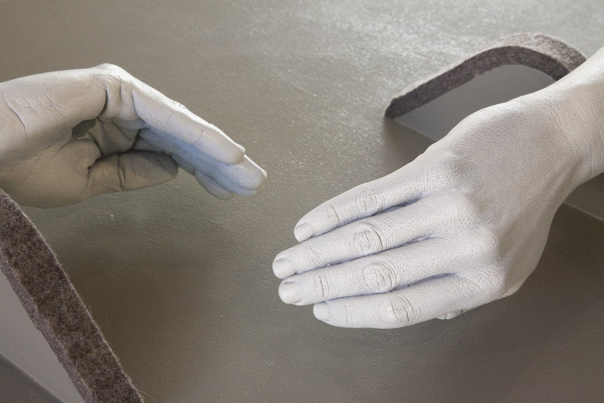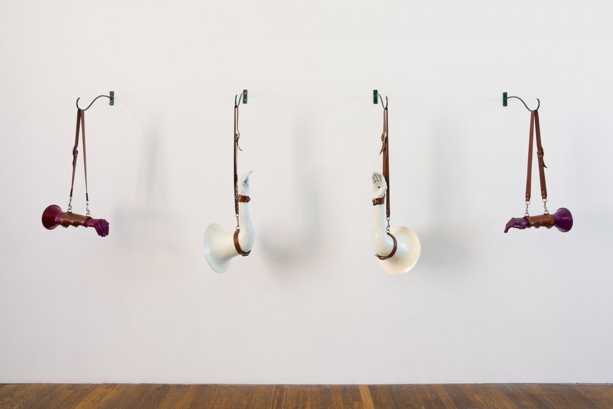 These sculptural instruments, synthesizing casts of the human figure with acoustic properties, demonstrate the symbolic and physical ways vocal sounds travel through the human body and affect the politics of the surrounding world. Hand gestures implemented for “Call to Arms” and “histophones” call out for social justice by literally covering up the mouth of the speaker, while simultaneously amplifying the voice. Whereas “Donald Trump(et)” effectively dampens hate speech by plugging a megaphone with a life cast of an anus, rendering it mute.