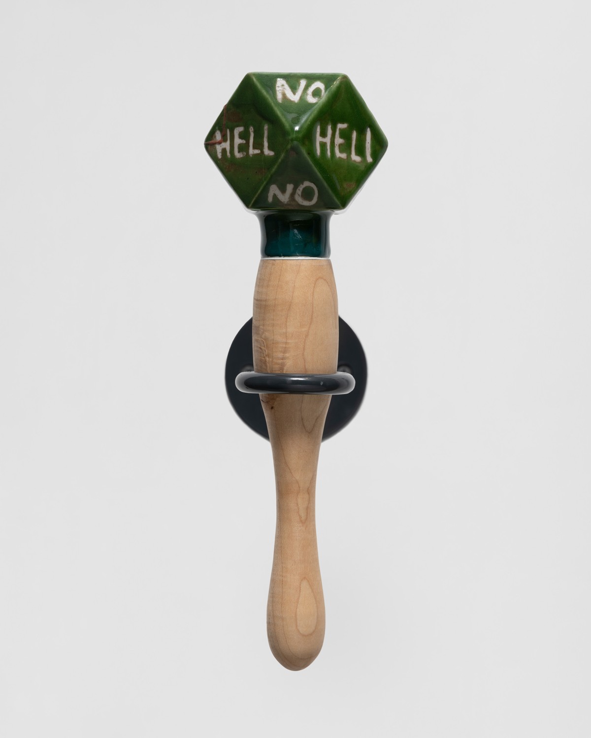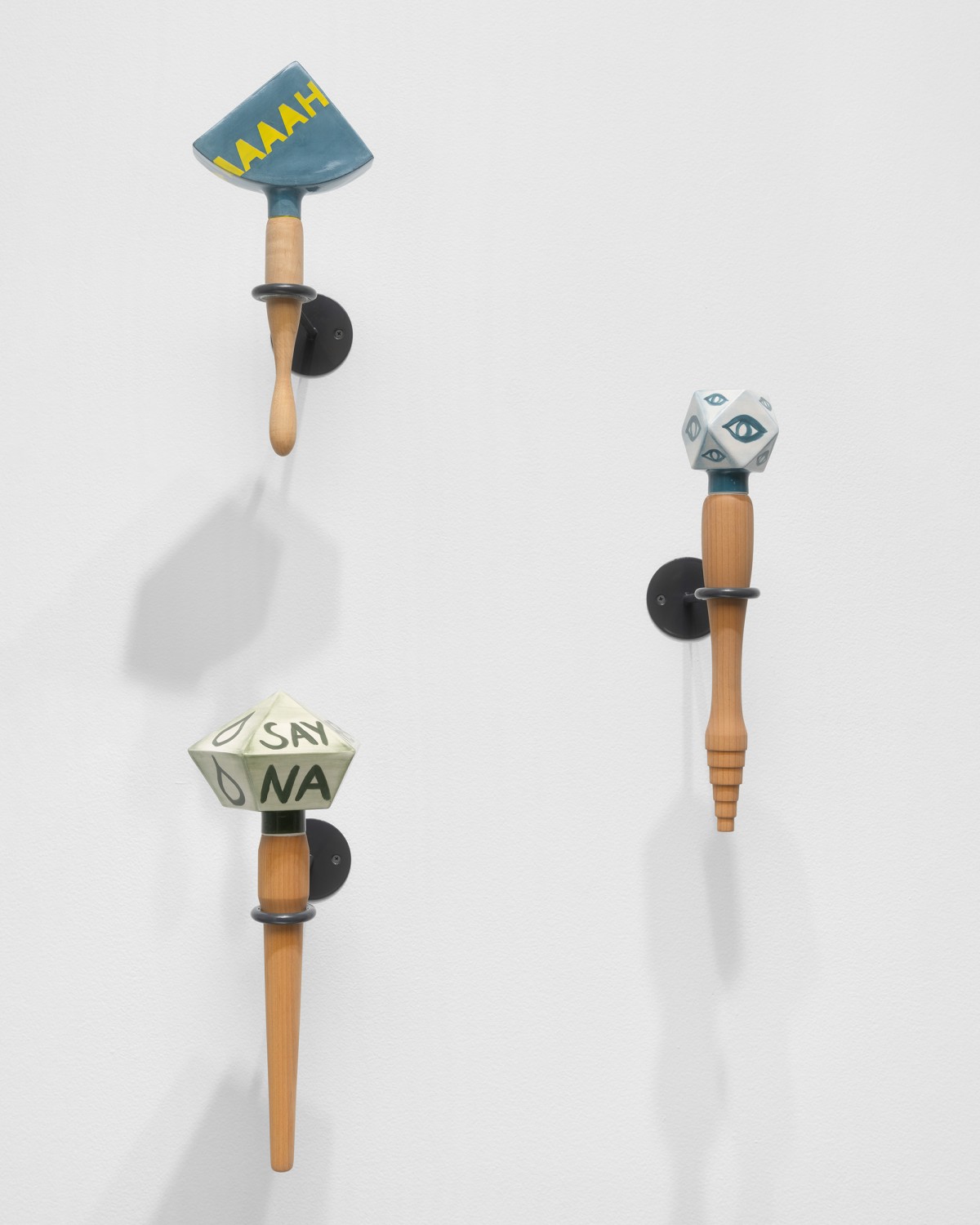 Constructed with a variety of materials, Mann’s rattles, noisemakers, trumpets, and other instruments are tools that galvanize the sonic energy of her work. From large fiberglass horns to smaller handheld ceramic rattles, each of these artworks act as their own distinct voice. When played together, they make up a unique collective unit; a synergistic roar that embodies the voices of those who strive for social change.
