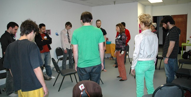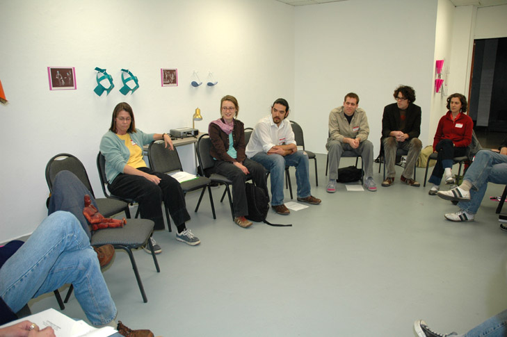 The Conversation Pieces project was geared toward exploring interpersonal communication within the conversational dimension. The week first addressed the nature and limits of conversation, and then moved to consider alternative methods of verbal and non-verbal communication. A week of workshops explored topics including: linguistics with C. J. Koenig, mediation with Dorit Cypis, Bohmian Dialog with Sara Roberts, Energy healing with Bita Sharif and Dyads with Paz Fernandez.  Elana Mann and Adam Overton composed a book of conversation scores to be performed during everyday conversation, which was available in the workshop space for free.  Also included in the space were props for conversation and collages using the 19th century painting genre called "Conversation Pieces" (which was the main inspiration for the name of the project).  Lastly, Elana and Adam enlisted friends and colleagues as subjects of conversation research and asked them to record aspects of daily conversation like eye contact, facial expression, etc.  This research information was compiled in a booklet in the workshop space.