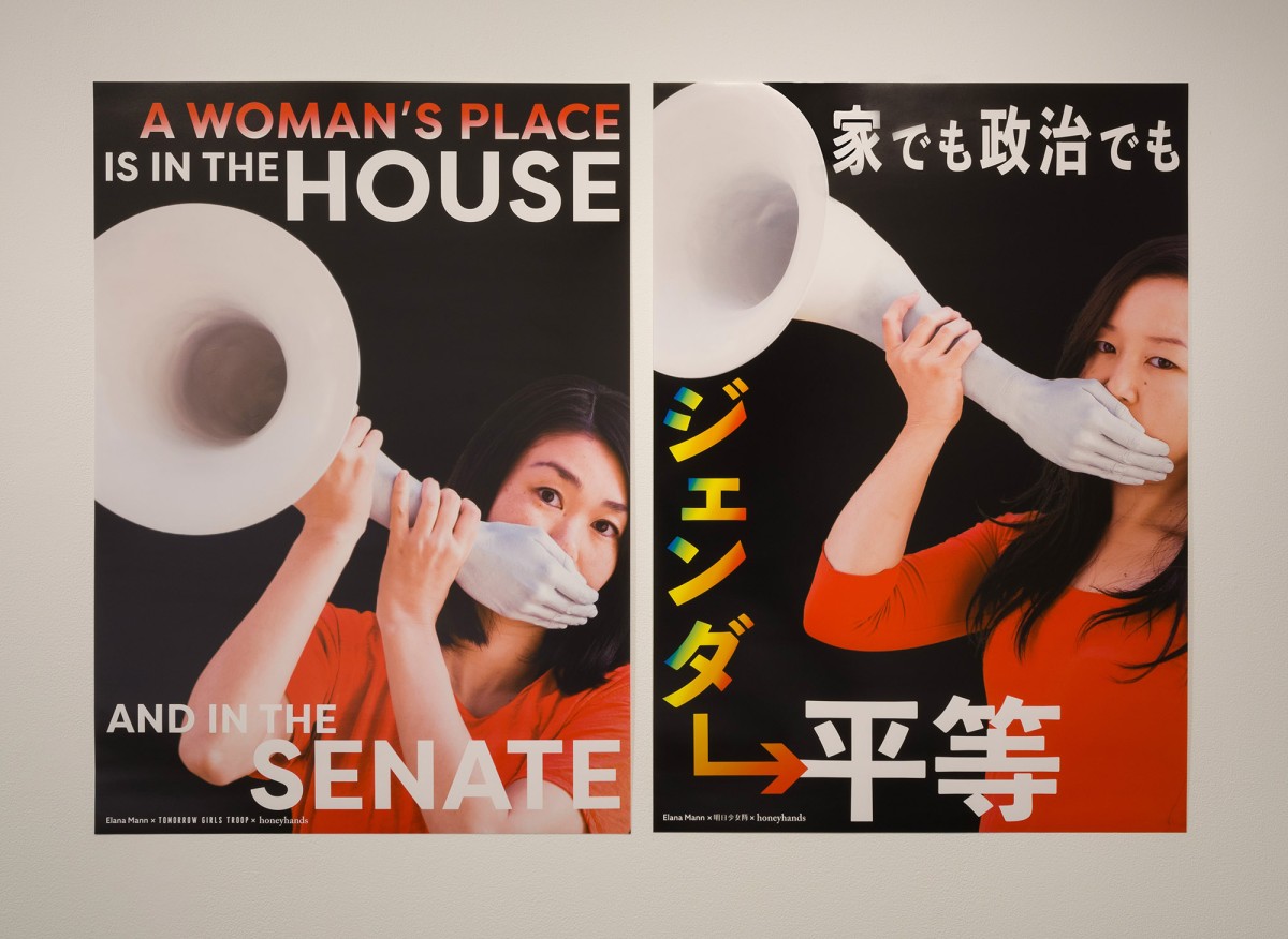 Mann’s instruments suffuse the human figure with acoustic properties. Her blame-game rattles and me-and-you-kazoos function both as highly crafted objects and utilitarian devices, accessible for audiences to play and handle in art as well as activist settings. In addition to the sculptural components Mann has invited composers, artists, and poets to produce scores for the exhibition, which will be performed throughout the show. The Japanese-Korean feminist art collective Tomorrow Girls Troop (TGT) also collaborated with Mann on posters that call attention to the erosion of women’s and LGBTQI rights in the current political administrations in the USA and Japan. Audiences can respond to these collaborative posters by calling 323 Projects, a telephone line as an exhibition site initiated by Tucker Neel, and leave messages answering the question: “What if women were in charge?” The audiences’ responses will be broadcast periodically from Pitzer’s clock tower throughout the duration of the exhibition.