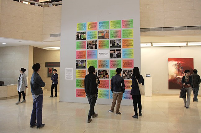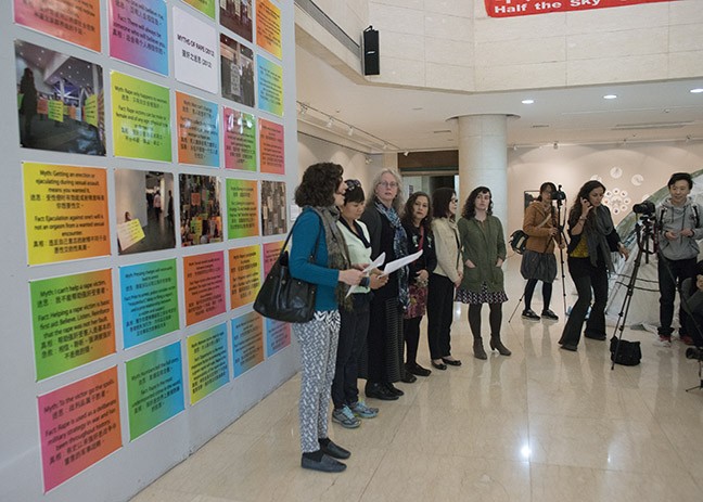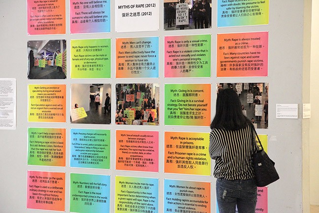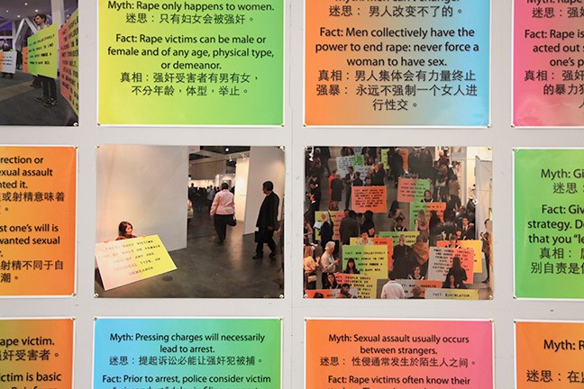 In 2014 Chan & Mann exhibited a new version of their work, Myths of Rape (2012), a reinterpretation of Leslie Labowitz-Starus’ Myths of Rape (1977), part of Suzanne Lacy’s Three Weeks in May (1977). The work was featured in a group exhibition at the LuXun Academy of Fine Arts entitled, "Half the Sky: Intersections in Social Practice Art," organized by the Women's Caucus for Art. In addition, Mann traveled to Shenyang for the opening of the exhibit and participated in 2-3 days of interactive events with the Chinese artists and students of the Academy. Mann led, with translation assistance by Jing Deng, a Mandarin/English call-and-response rendition of various myths and facts about rape.