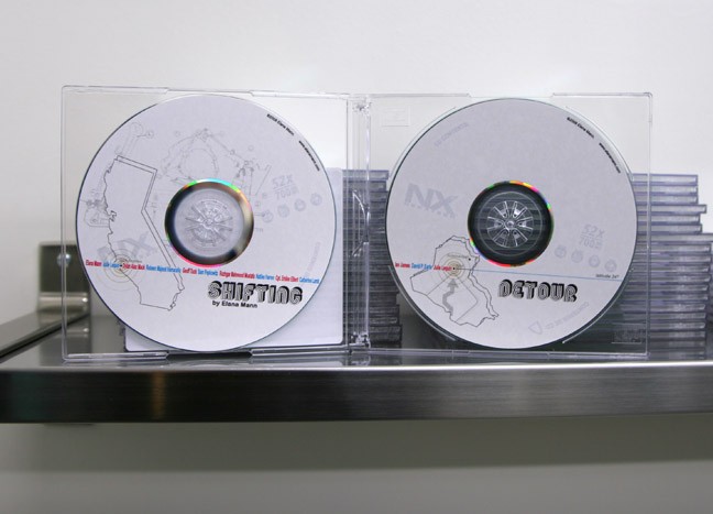 Shifting is an unlimited edition CD with a 28 min. audio track (the average commuting time in Los Angeles in 2008). The audio included contributions from eleven commuters in Los Angeles and Iraq. Viewers are encouraged to take a CD with them to play during their commute.