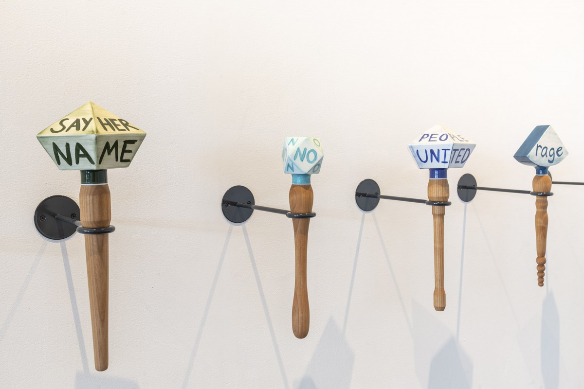 Unidentified Bright Object 11–60 consists of 50 rattles, each made with a distinct turned wood handle and a cast ceramic top containing loose, sound-making material. The ceramic tops are individually adorned with a variety of phrases, such as calls to action (e.g., “Say His Name/Say Her Name”), statements (“Truth”), celebrations of the collective (“People Power”), or onomatopoeia (“SSSSSS”). Viewers may engage with the rattles however they wish, either visually or by touch.