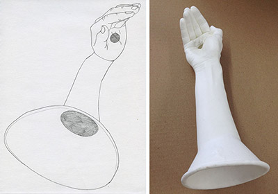 Directly inspired by Perret’s ingenious sound technology, I invented the “histophone,” a sculptural listening device designed to amplify the murmurs of history at the Getty Villa. (Histo means tissue in Greek, while phone refers to sound.) The histophone is composed of a hollowed-out sculpture of my right hand and forearm—cast in the contemporary medium of plastic—cupping my right ear and flaring out at the base like a trumpet. Histophones can also serve as speaking devices, magnifying an individual’s voice while simultaneously covering her or his mouth.