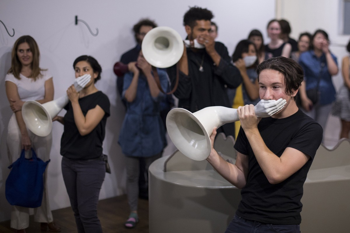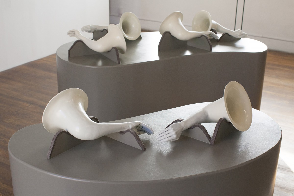 These sculptural instruments, synthesizing casts of the human figure with acoustic properties, demonstrate the symbolic and physical ways vocal sounds travel through the human body and affect the politics of the surrounding world. Hand gestures implemented for “Call to Arms” and “histophones” call out for social justice by literally covering up the mouth of the speaker, while simultaneously amplifying the voice. Whereas “Donald Trump(et)” effectively dampens hate speech by plugging a megaphone with a life cast of an anus, rendering it mute.