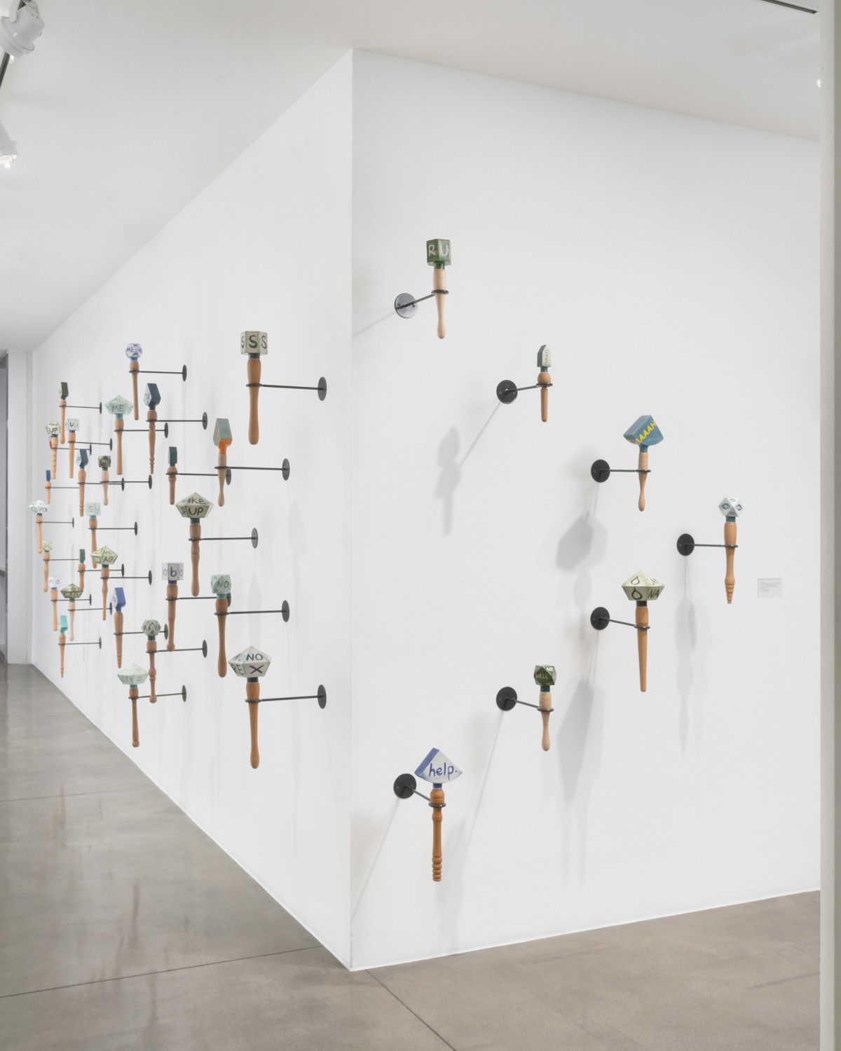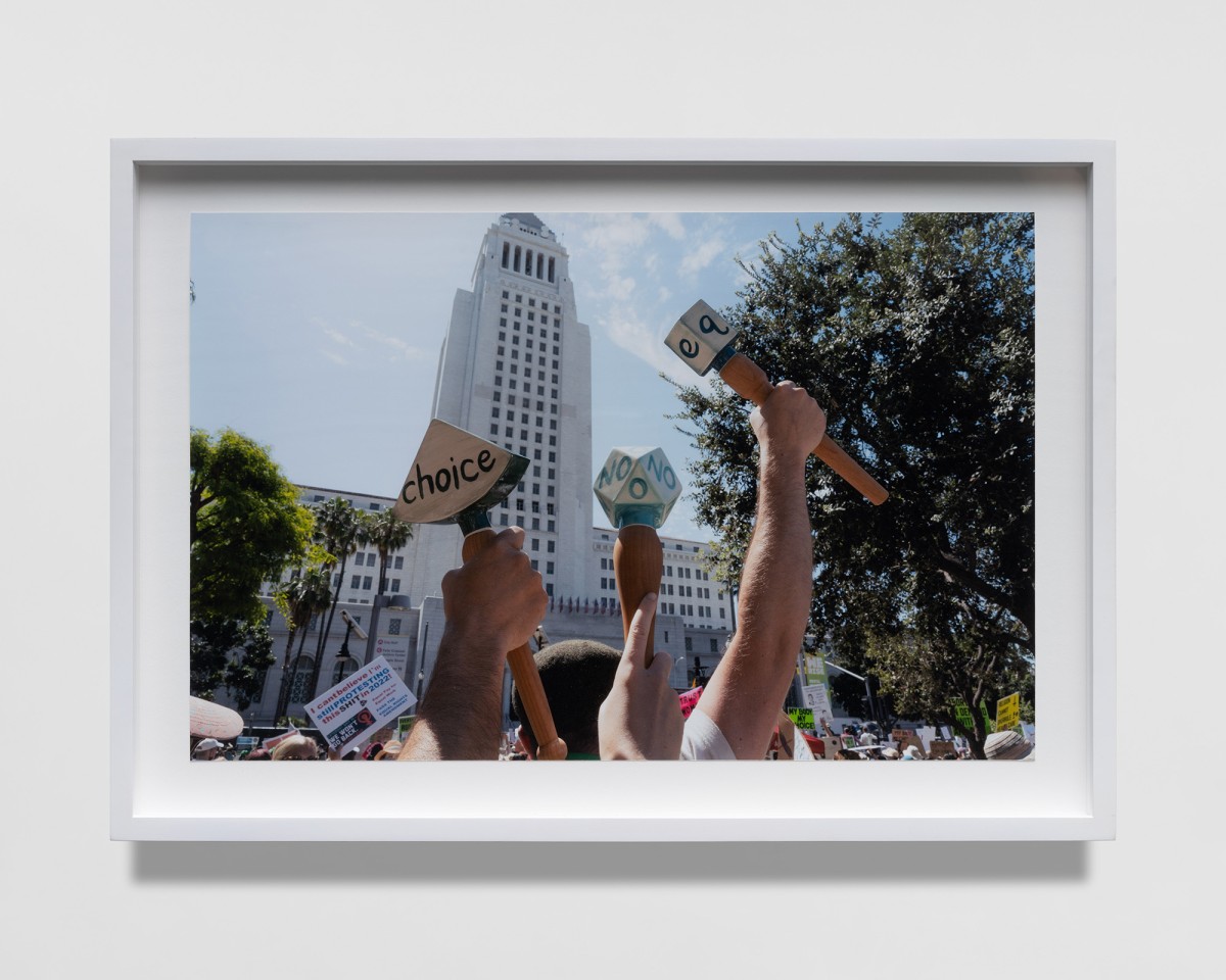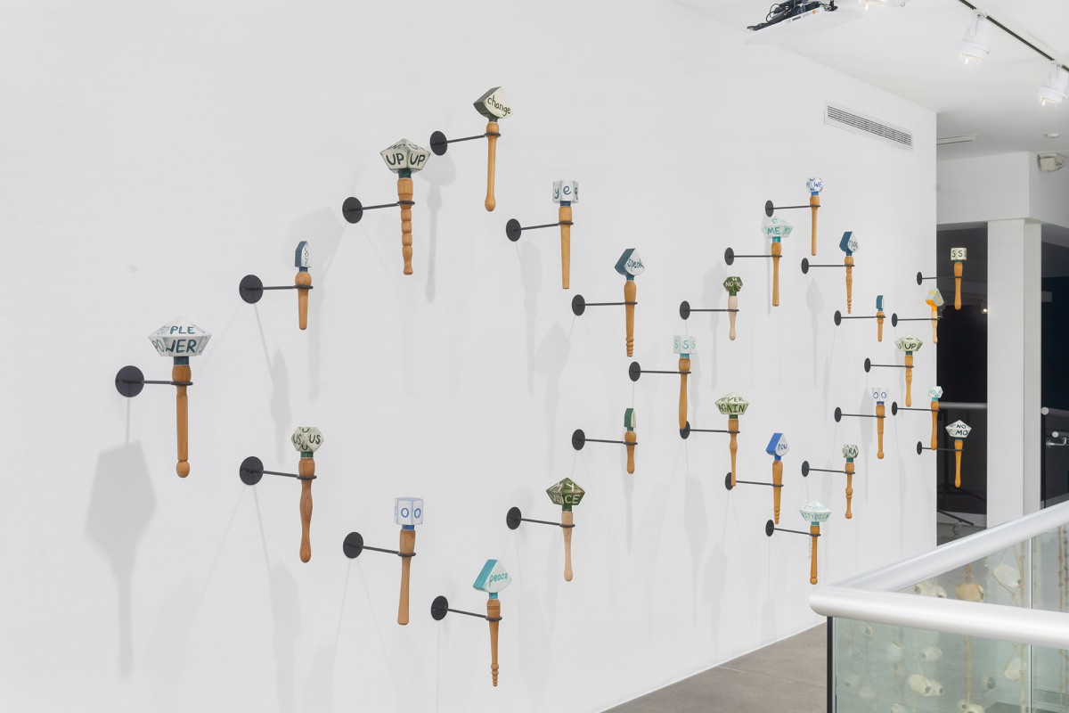 Constructed with a variety of materials, Mann’s rattles, noisemakers, trumpets, and other instruments are tools that galvanize the sonic energy of her work. From large fiberglass horns to smaller handheld ceramic rattles, each of these artworks act as their own distinct voice. When played together, they make up a unique collective unit; a synergistic roar that embodies the voices of those who strive for social change.