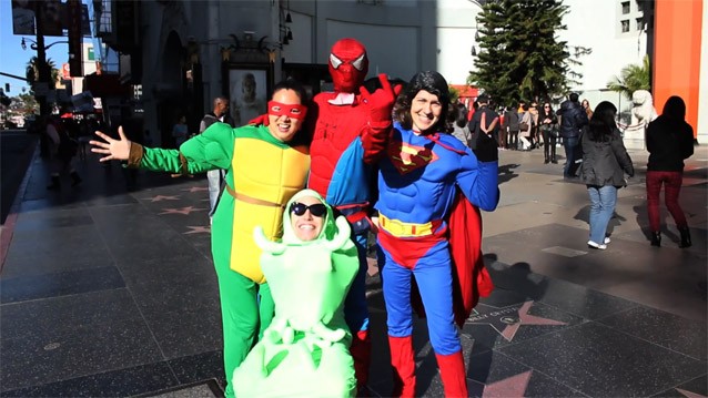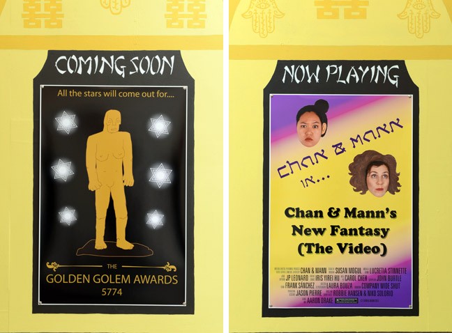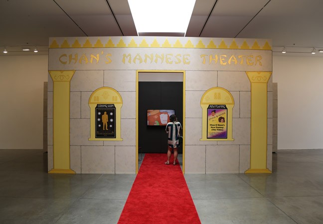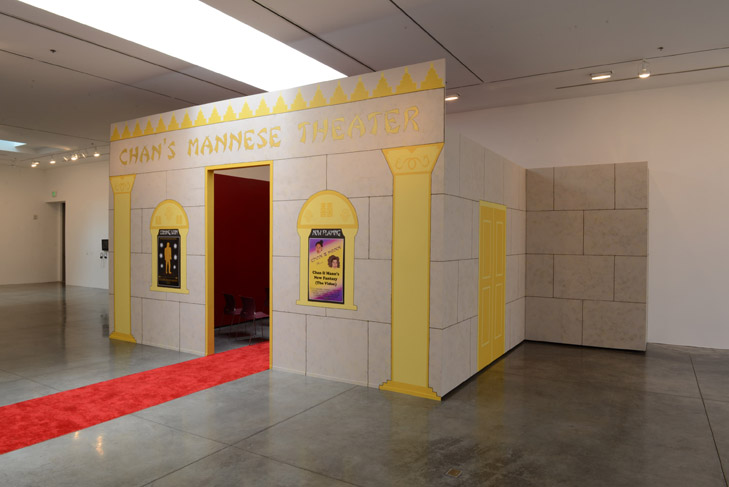 Chan's Mannese Theater was a video installation incorporating a painted theater and a video screening room. "Now Playing" in the theater was Chan & Mann's New Fantasy (The Video) (2013), a video which draws upon iconographic tropes of traditional figurative and still life painting to humorously deconstruct discourse in cultural identity. The absurdist video opens upon a painted scene depicting a not-so-ordinary day in the studio with Chan & Mann, whose faces appear as cut-outs in a painting. They converse with a cast of painted characters, such as Dorah the Menorah, Michelle Obama, fortune cookies, and a feminist megaphone. The characters are voiced by established and emerging members of the Los Angeles contemporary art community. Together, they wrestle with issues of feminist and ethnic identity. Live action scenes continue the narrative into everyday and imaginary spaces, including Hollywood's famed Grauman’s Chinese Theater. The video climaxes in a riveting third-wave feminist slam poetry performance by rising star Frank Sánchez.