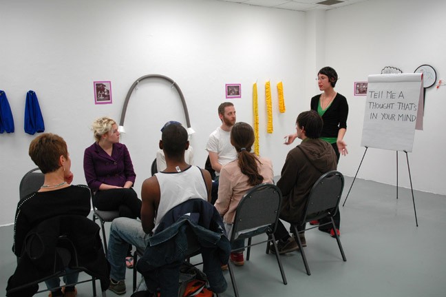 The Conversation Pieces project was geared toward exploring interpersonal communication within the conversational dimension. The week first addressed the nature and limits of conversation, and then moved to consider alternative methods of verbal and non-verbal communication. A week of workshops explored topics including: linguistics with C. J. Koenig, mediation with Dorit Cypis, Bohmian Dialog with Sara Roberts, Energy healing with Bita Sharif and Dyads with Paz Fernandez.  Elana Mann and Adam Overton composed a book of conversation scores to be performed during everyday conversation, which was available in the workshop space for free.  Also included in the space were props for conversation and collages using the 19th century painting genre called "Conversation Pieces" (which was the main inspiration for the name of the project).  Lastly, Elana and Adam enlisted friends and colleagues as subjects of conversation research and asked them to record aspects of daily conversation like eye contact, facial expression, etc.  This research information was compiled in a booklet in the workshop space.