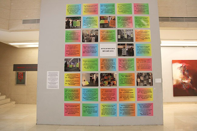In 2014 Chan & Mann exhibited a new version of their work, Myths of Rape (2012), a reinterpretation of Leslie Labowitz-Starus’ Myths of Rape (1977), part of Suzanne Lacy’s Three Weeks in May (1977). The work was featured in a group exhibition at the LuXun Academy of Fine Arts entitled, "Half the Sky: Intersections in Social Practice Art," organized by the Women's Caucus for Art. In addition, Mann traveled to Shenyang for the opening of the exhibit and participated in 2-3 days of interactive events with the Chinese artists and students of the Academy. Mann led, with translation assistance by Jing Deng, a Mandarin/English call-and-response rendition of various myths and facts about rape.