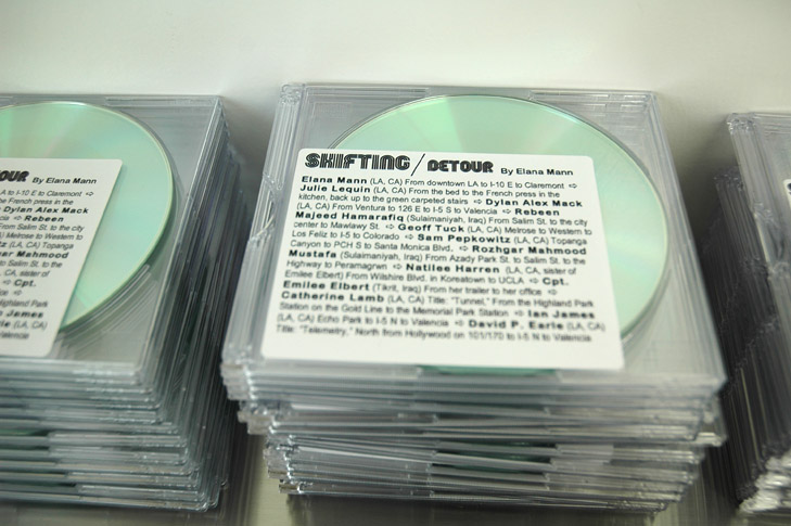 Shifting is an unlimited edition CD with a 28 min. audio track (the average commuting time in Los Angeles in 2008). The audio included contributions from eleven commuters in Los Angeles and Iraq. Viewers are encouraged to take a CD with them to play during their commute.