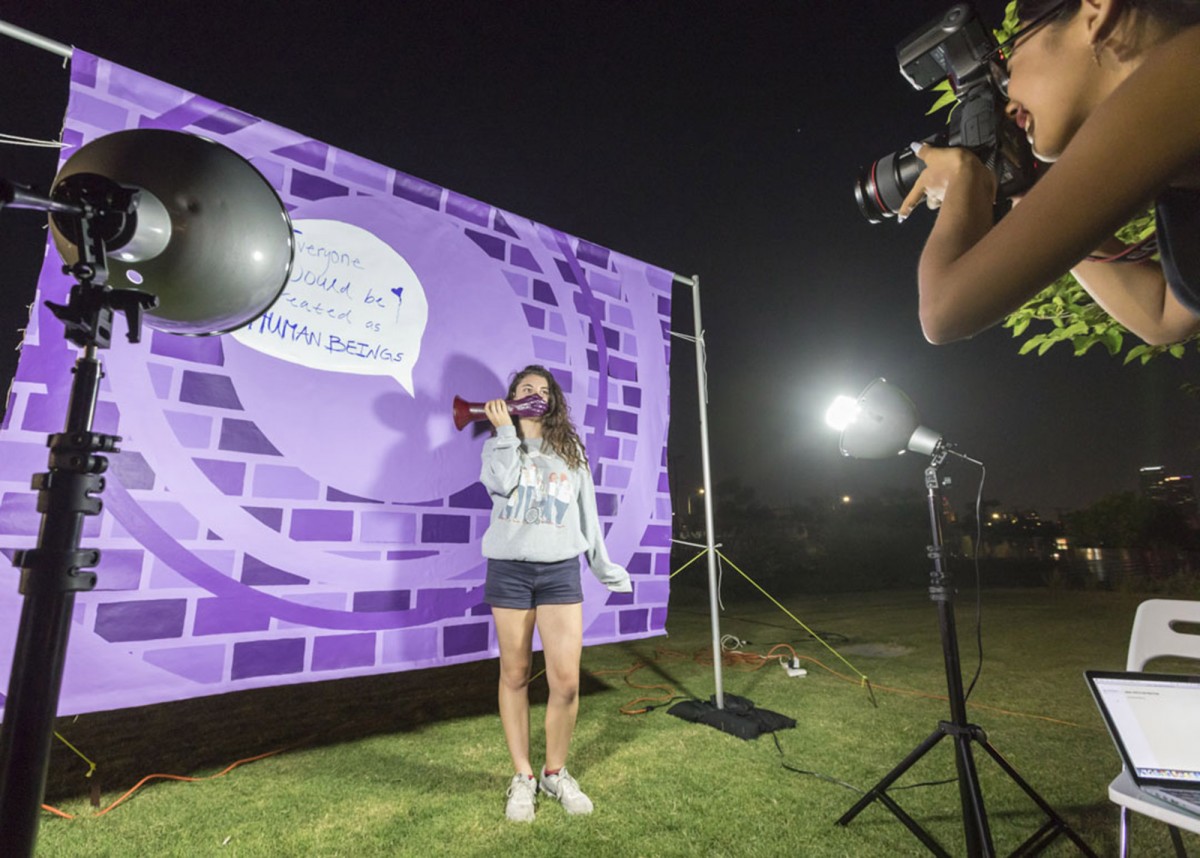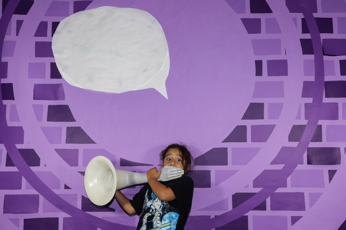 Voicing and Revoicing, a collaborartion with student photographers from the comnunity organization Las Fotos Project, asked participants to answer the question "What if women were in charge?". Participants were then invited to pose with their written responses in front of a hand painted photo backdrop. Voicing and Revoicing was part of the Aint' I a Womxn Festival, produced by Freewaves, which took place in July, 2018 in the Los Angeles State Historic Park, in downtown Los Angeles, CA.