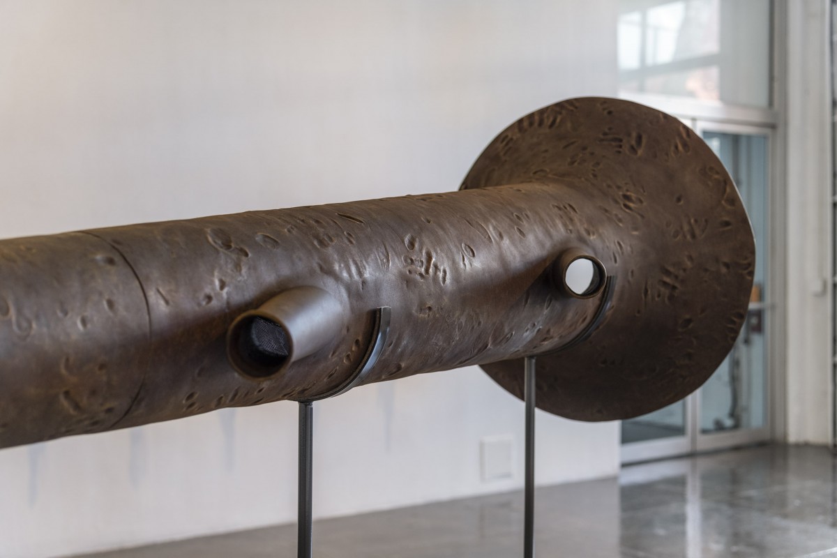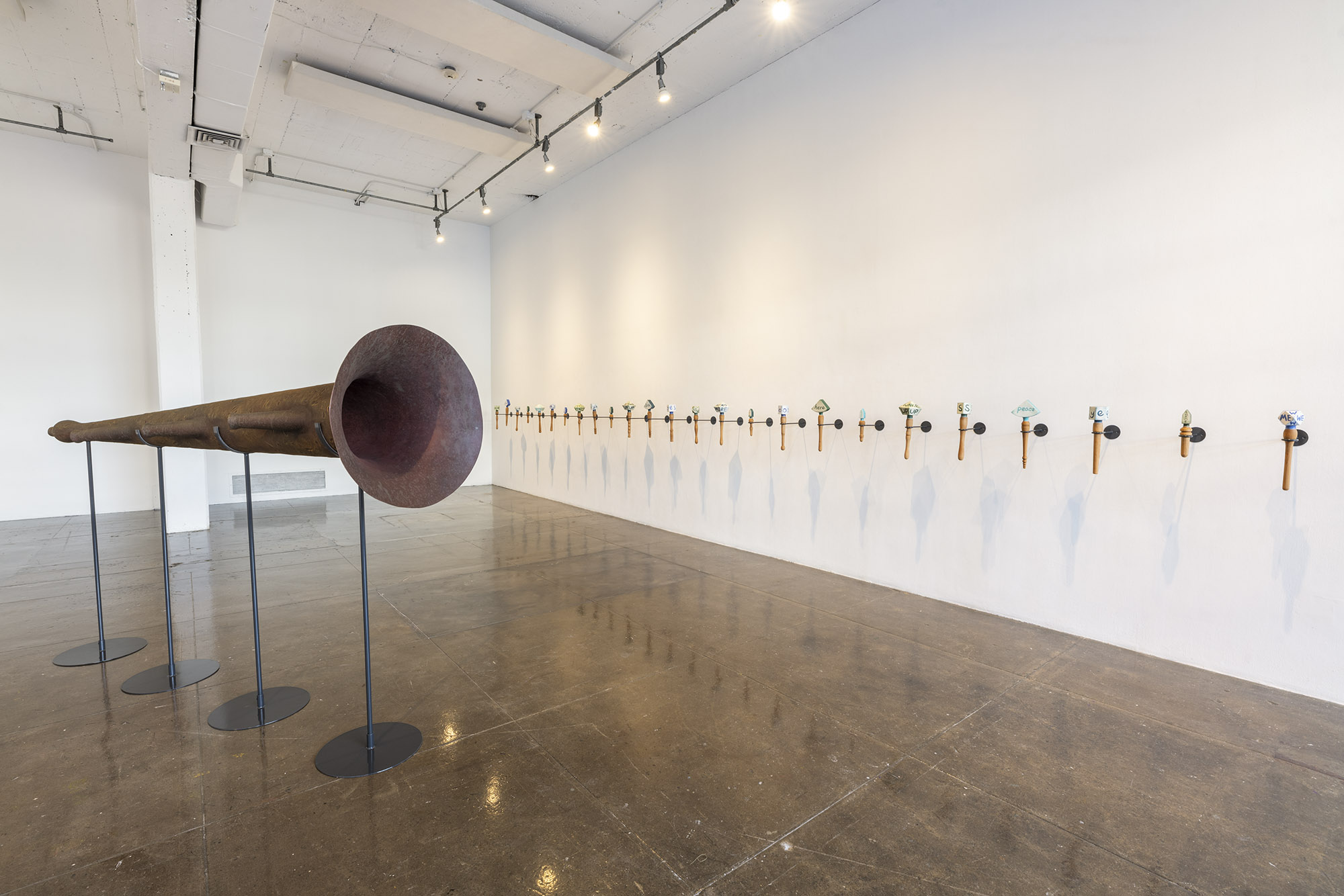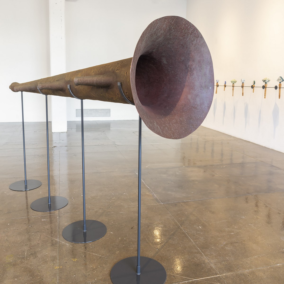 Our work is never done (unfinished business) is modeled on the “Mega-kazoo-horn” originally made by the legendary folk music figure Charles Chase. Chase was an active socialist and brought the instrument to local protests in his hometown of Claremont, CA, in the 1970s. The horn features six speaking tubes, rather than only one, therefore harnessing the power of the collective voice. Mann started the sculpture over a year ago, but in the social-distancing context of COVID-19, the object’s meaning and function have shifted. Rendered temporarily unusable as a musical instrument, it currently operates as more of symbol of collective action. Mann hopes to employ the horn in future demonstrations and marches when it is once again safe to share.