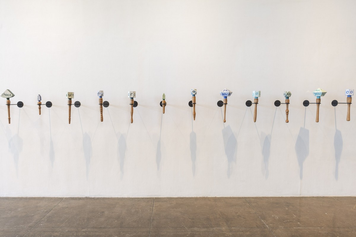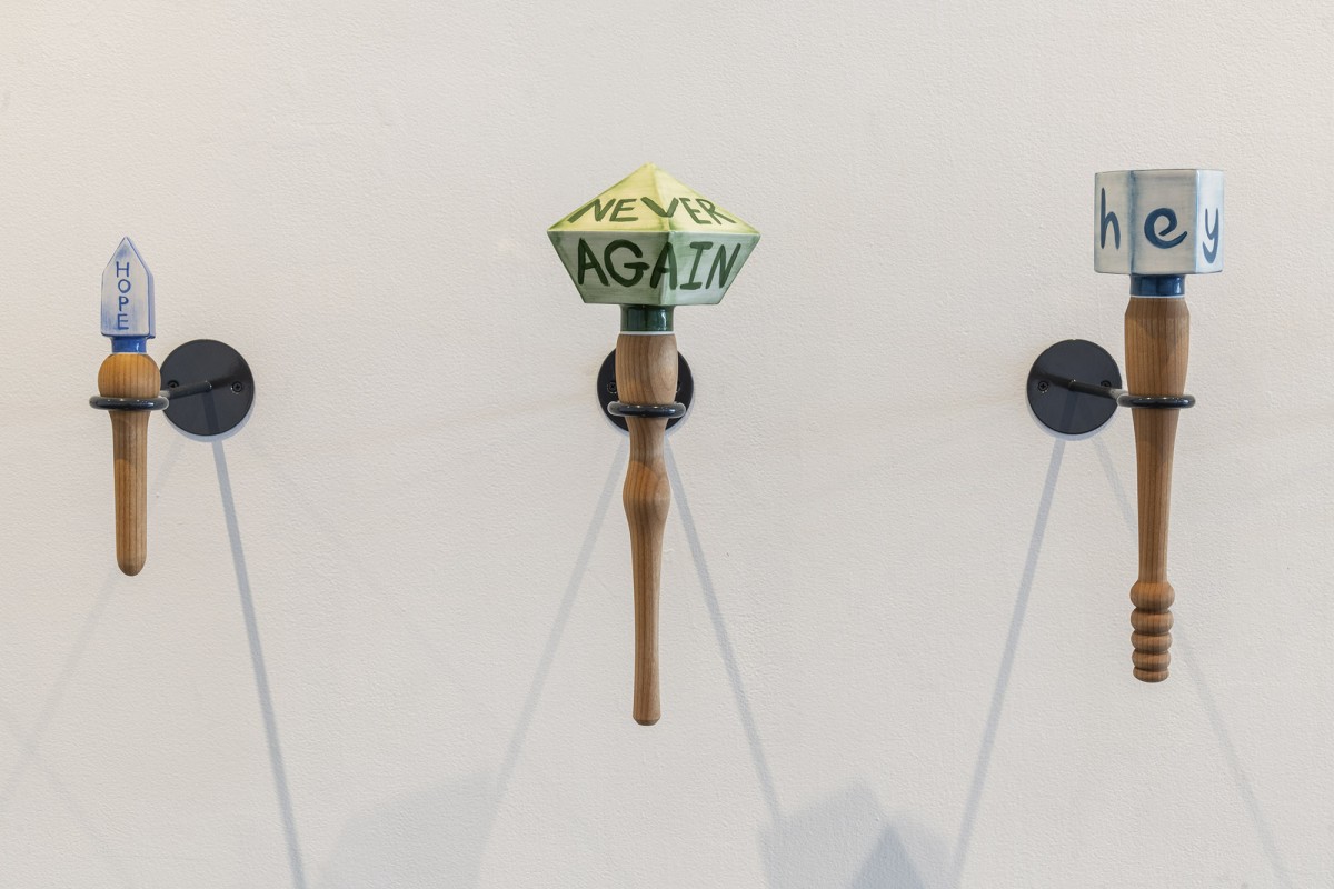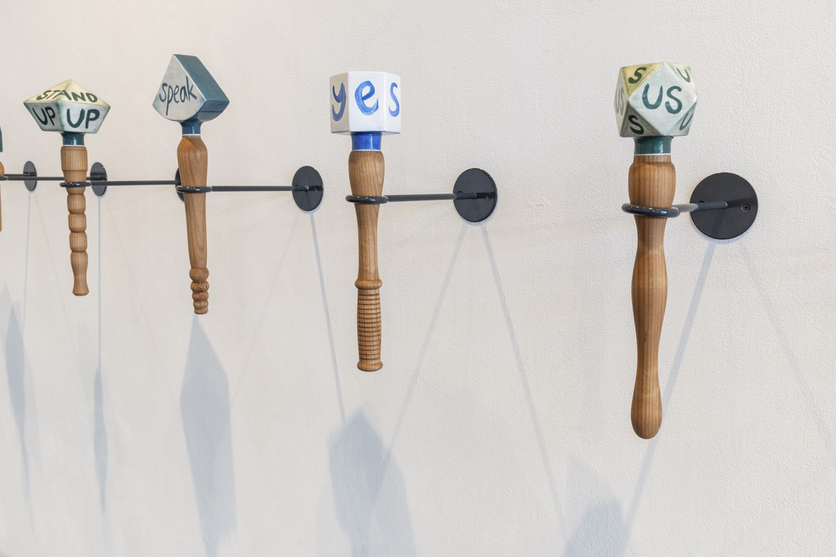 Unidentified Bright Object 11–60 consists of 50 rattles, each made with a distinct turned wood handle and a cast ceramic top containing loose, sound-making material. The ceramic tops are individually adorned with a variety of phrases, such as calls to action (e.g., “Say His Name/Say Her Name”), statements (“Truth”), celebrations of the collective (“People Power”), or onomatopoeia (“SSSSSS”). Viewers may engage with the rattles however they wish, either visually or by touch.