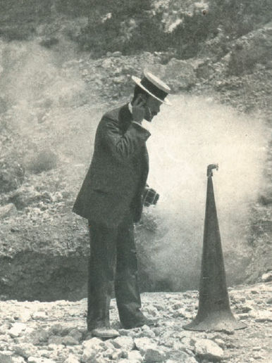 F. A. Perret with an improvised “geophone,” listening to subterranean noises at the Campi Flegrei, Italy, c. 1906-1907. Source: “The Day’s Work of a Volcanologist.” The World’s Work, V. 25, November, 1907.