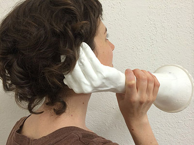 Directly inspired by Perret’s ingenious sound technology, I invented the “histophone,” a sculptural listening device designed to amplify the murmurs of history at the Getty Villa. (Histo means tissue in Greek, while phone refers to sound.) The histophone is composed of a hollowed-out sculpture of my right hand and forearm—cast in the contemporary medium of plastic—cupping my right ear and flaring out at the base like a trumpet. Histophones can also serve as speaking devices, magnifying an individual’s voice while simultaneously covering her or his mouth.